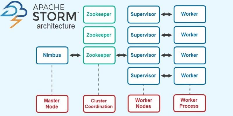 An Apache Storm cluster consists of a master node and several worker nodes. The master runs a daemon called Nimbus, which coordinates the cluster by distributing code, assigning tasks, and recovering from failures. Nimbus itself doesn’t process data. Each worker node runs a Supervisor daemon that manages worker processes, which are responsible for executing spouts and bolts.