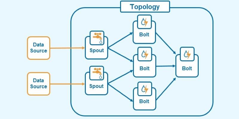 At the heart of a topology are two types of components: spouts and bolts. Spouts act as data feeders, pulling records — called tuples — from sources like message queues, log files, or databases, and streaming them into the system. Bolts do the heavy lifting: they transform, filter, aggregate, or otherwise process the tuples before passing them along. Together, they form a directed acyclic graph, with each stage representing a specific processing step.